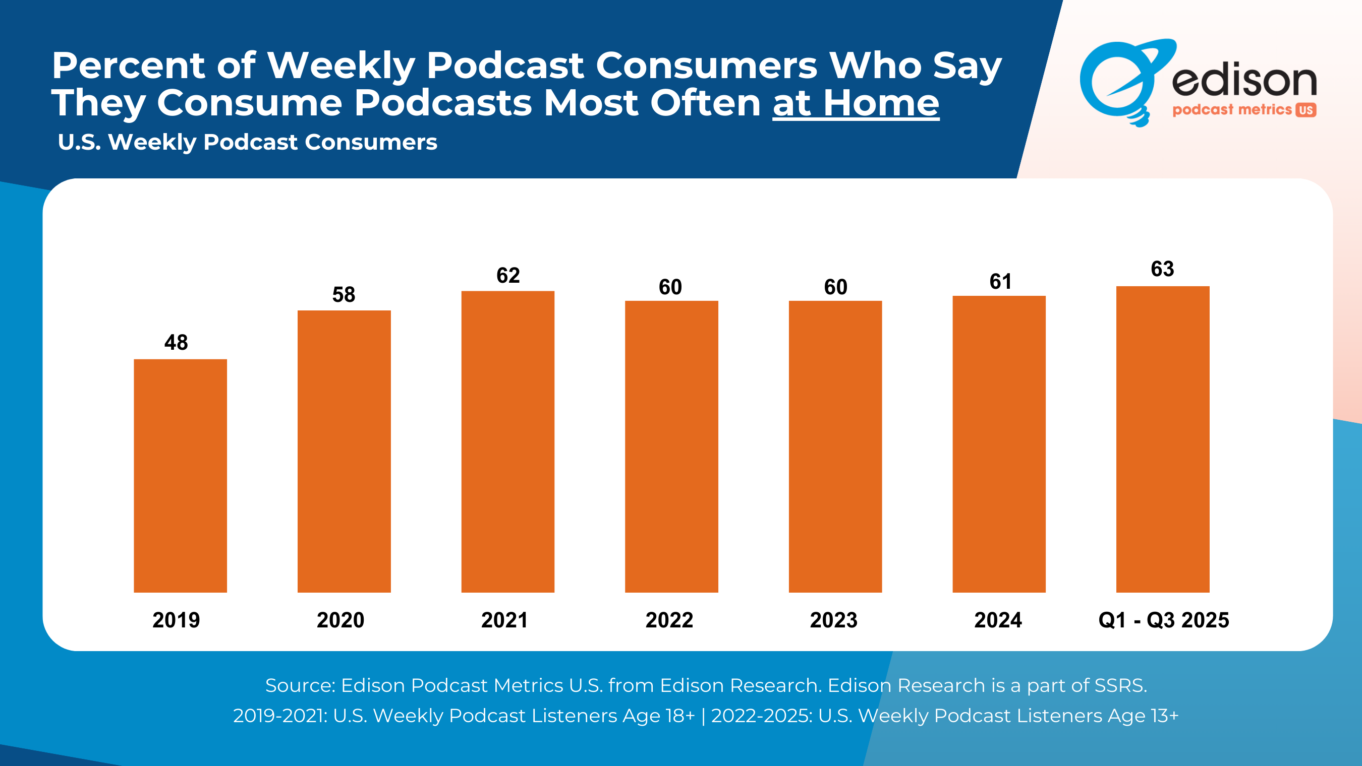 Our last insight of 2025, from Share of Ear®, showcased how the COVID-19 pandemic dramatically shifted audio listening time into the home from 2020 – 2022. The majority of audio listening remains at-home, but we now see a shift back towards pre-COVID levels. Our first insight of 2026, from Edison Podcast Metrics, illustrates where U.S. weekly podcast consumers most frequently consume podcasts and how this specific sector of the audio world has changed over time.