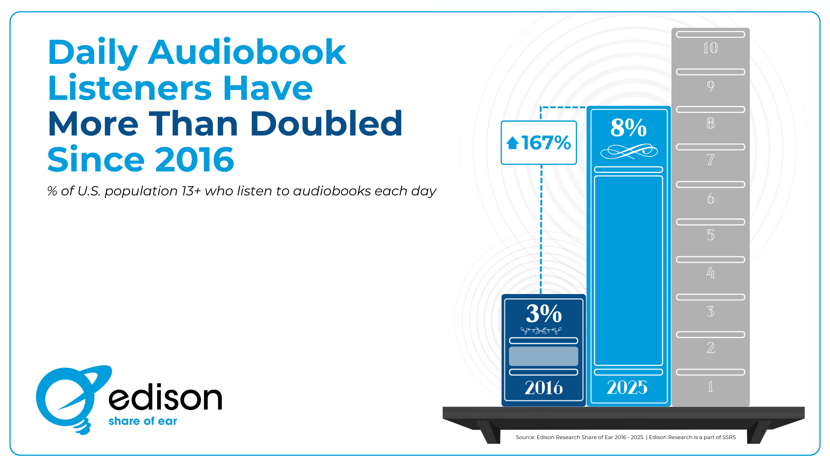 Back in 2016, 3% of Americans 13+ spent any of their daily audio time with audiobooks . As of 2025, that reach number grew to 8% of the American 13+ population. This accounts for a 167% increase in people listening to audiobooks. While we’re not able to say definitively what has caused this growth, one possible factor is broader access to audiobooks through popular streaming platforms and subscription services.