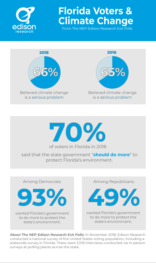 66% of Floridian voters in 2018 and 65% in 2016 said that climate change is a serious problem, according to the Edison Research Exit Polls. While the 2018 Exit Poll was conducted less than a month after a destructive category 5 hurricane hit Florida, voter concern changed little in the state from 2016 to 2018.