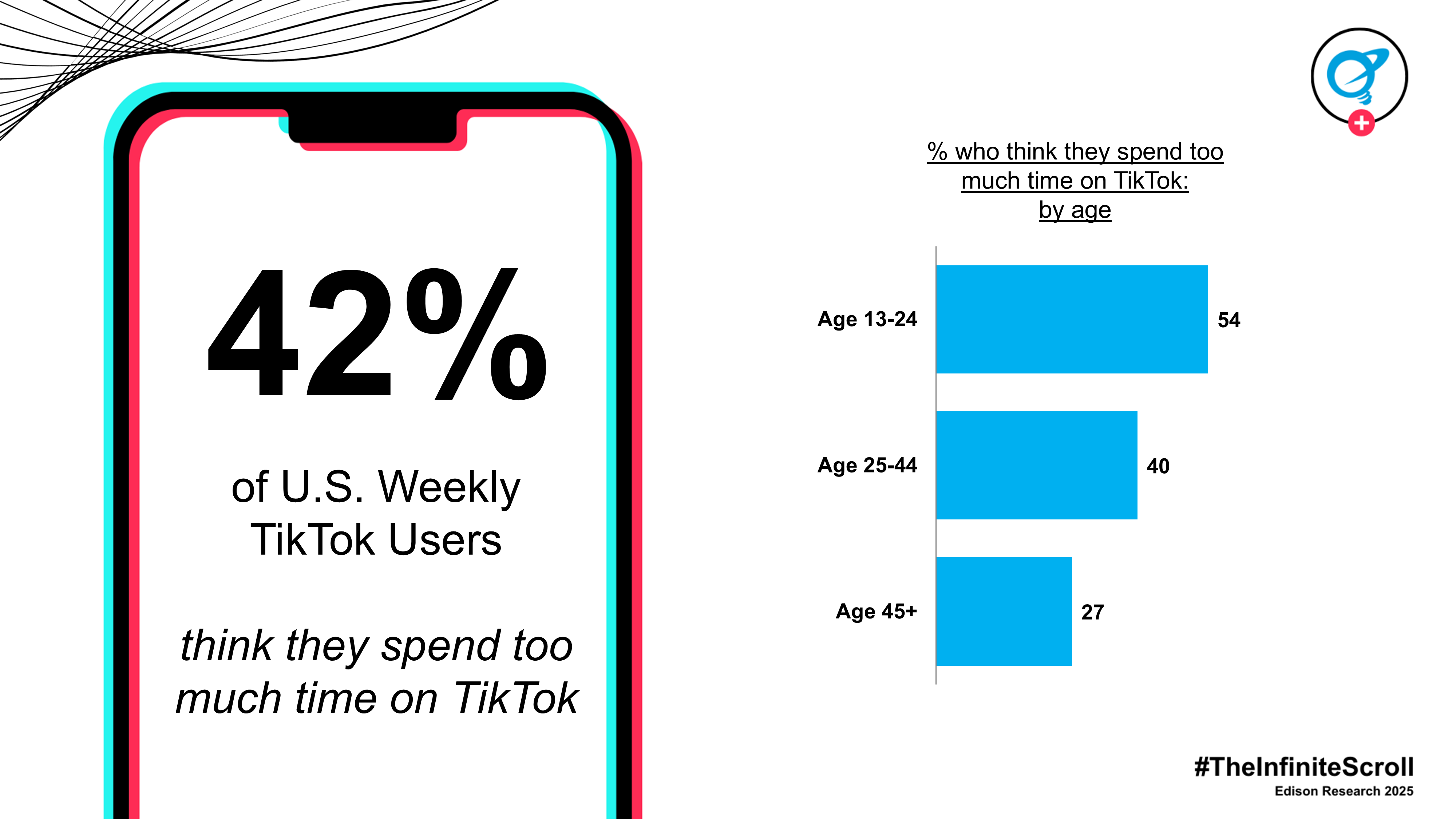 Overall, 42% of U.S. weekly TikTok users believe they spend too much time on the platform. While this is a significant percentage of weekly users, we see this number increase considerably among one of TikTok’s most active audiences; Americans 13-24. Over one-half (54%) of weekly TikTok users between the ages of 13-24 believe they spend too much time on the platform. This equates to approximately 21 million Americans. Weekly users 25-44 and 45+ are both significantly less likely to say they spend too much time on TikTok, at 40% and 27%.
