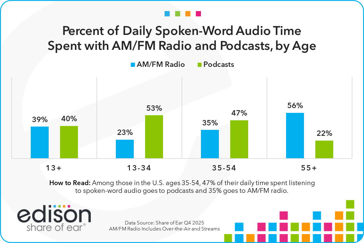 Among Americans 13+, 40% of time spent with spoken-word audio is spent listening to podcasts; 39% is spent listening to AM/FM radio (including AM/FM streams), the historic spoken-word listening leader.