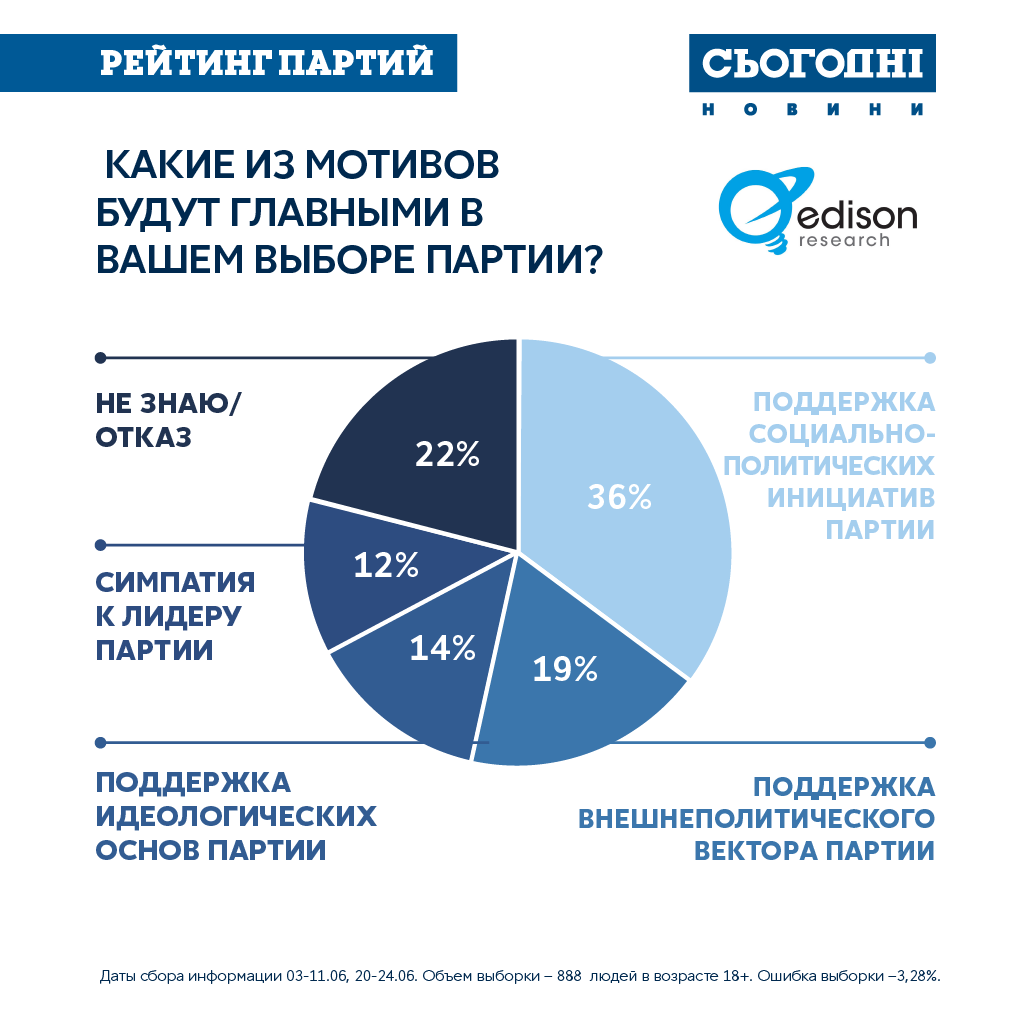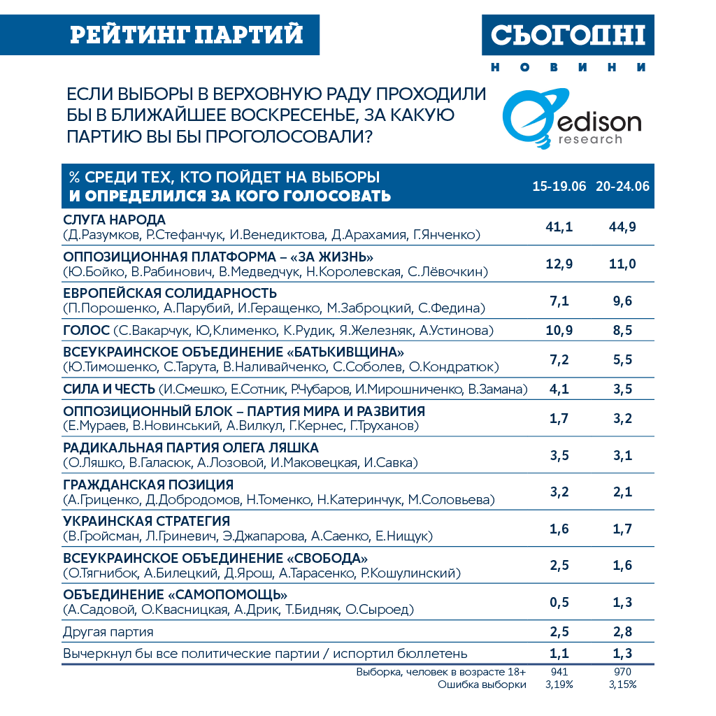The survey was conducted by Edison Research via telephone and in-person interviews in all regions of Ukraine, except Crimea and the occupied part of the Donbass. For surveys conducted between June 15th and June 19th, 941 respondents were interviewed (886 by telephone, 55 personal interviews in villages. The margin of error does not exceed 3.2%). For interviews conducted between June 20th and June 24th, 970 respondents were interviewed (910 phones, 60 personal interviews in villages. The margin of error does not exceed 3.15%).