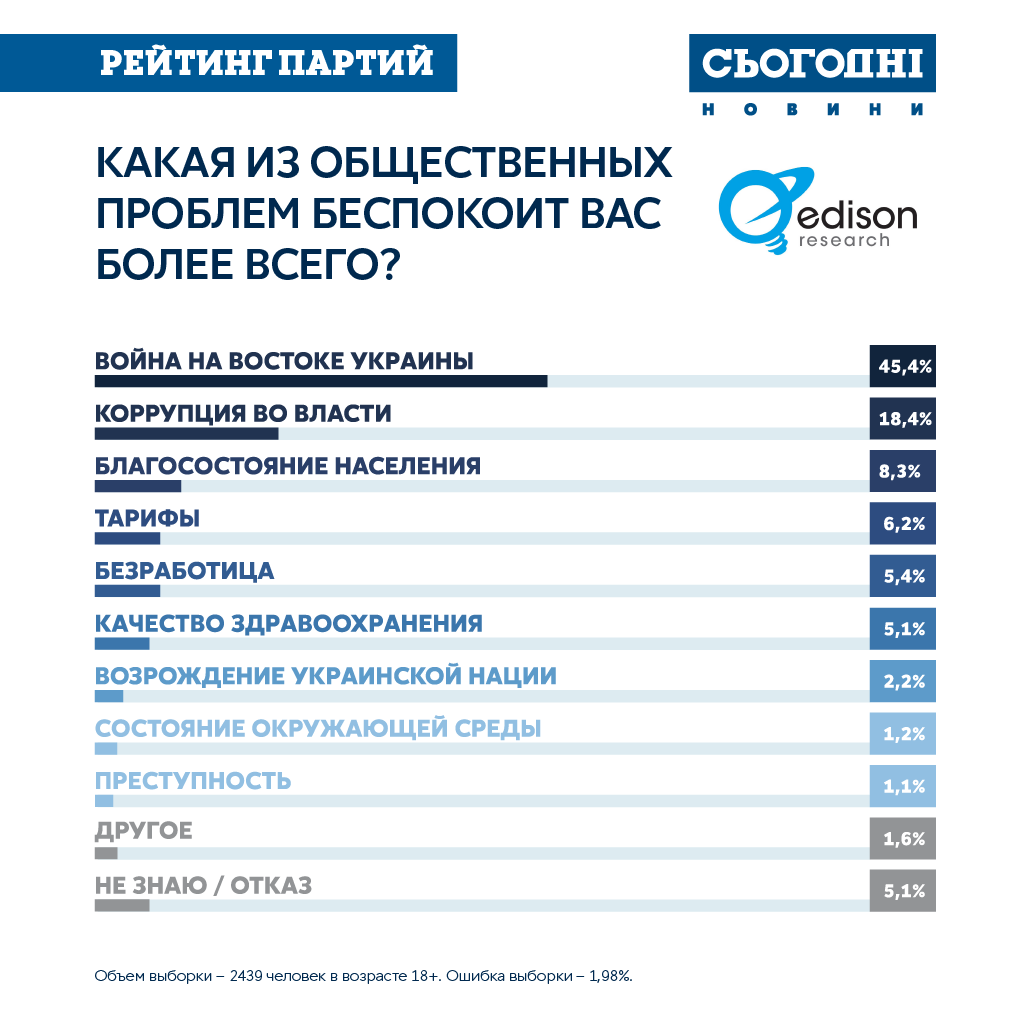 The survey results also indicate that the Ukrainians are most concerned about the war in Eastern Ukraine (45%) and corruption in power (18%). Ukrainians are also worried about the welfare of the population (8%), tariffs (6%), quality of health care (5%) and unemployment (5%). Ukrainians are significantly less concerned about the revival of the Ukrainian nation (2%), the state of the environment (1%) and crime (1%). Five percent of respondents said this was difficult to answer.