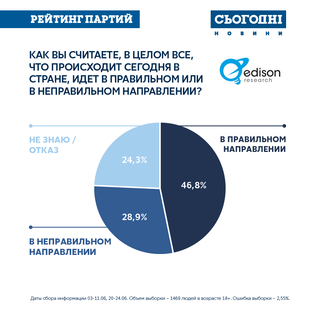 Forty-six percent of Ukrainians believe that, in general, everything that is happening now in Ukraine is going in the right direction. Almost 29% of Ukrainians do not agree with this, and another 24% did not give an answer.