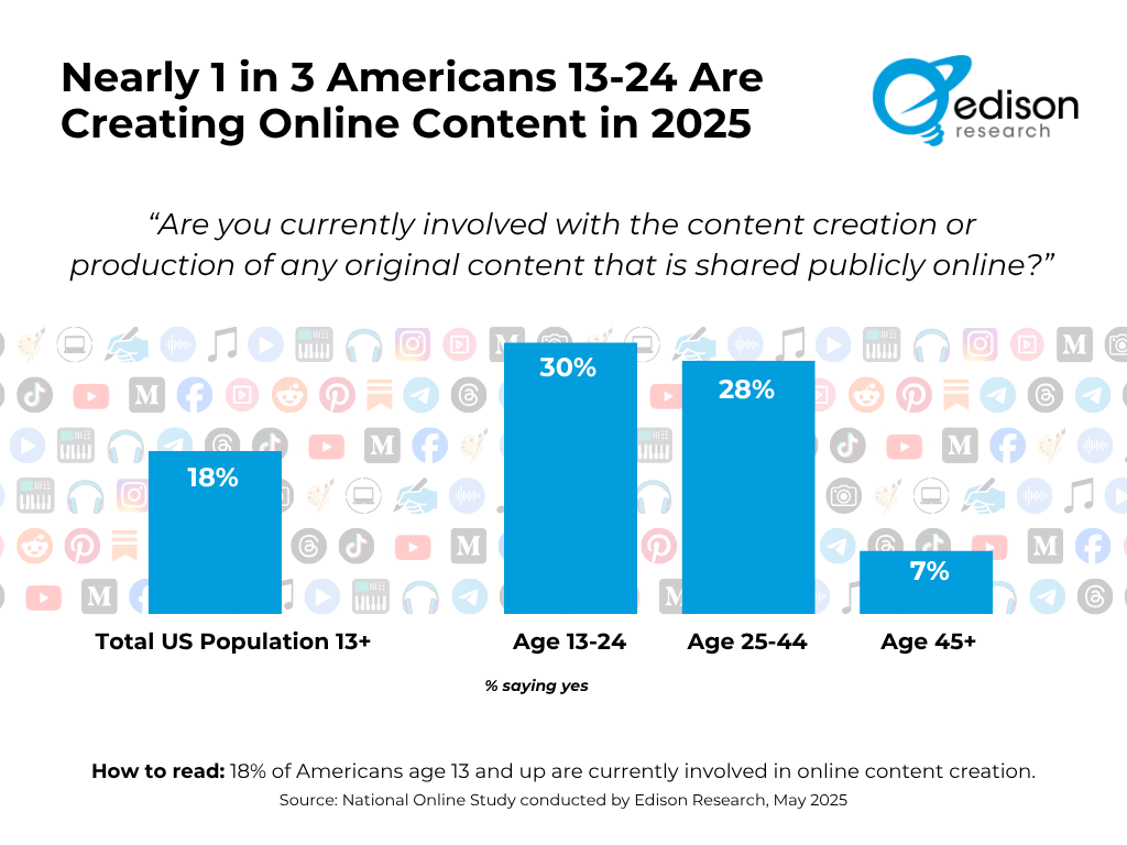 The influencer industry plays an integral and immense role in both the culture and economy of the United States. According to a 2024 article from Forbes, the influencer industry is worth approximately $250 billion and is expected to reach $500 billion by 2027. Creators like Mr. Beast, Charli D’Amelio, Alix Earle, and Ms. Rachel all have millions of followers as well as lucrative brand and merchandising deals. While many of us are familiar with these household names, Edison Research wanted to capture and understand what percent of the overall American population consider themselves digital content creators. The following showcases some of the never-before-seen data we have about digital content creators from a national online survey among Americans 13+.