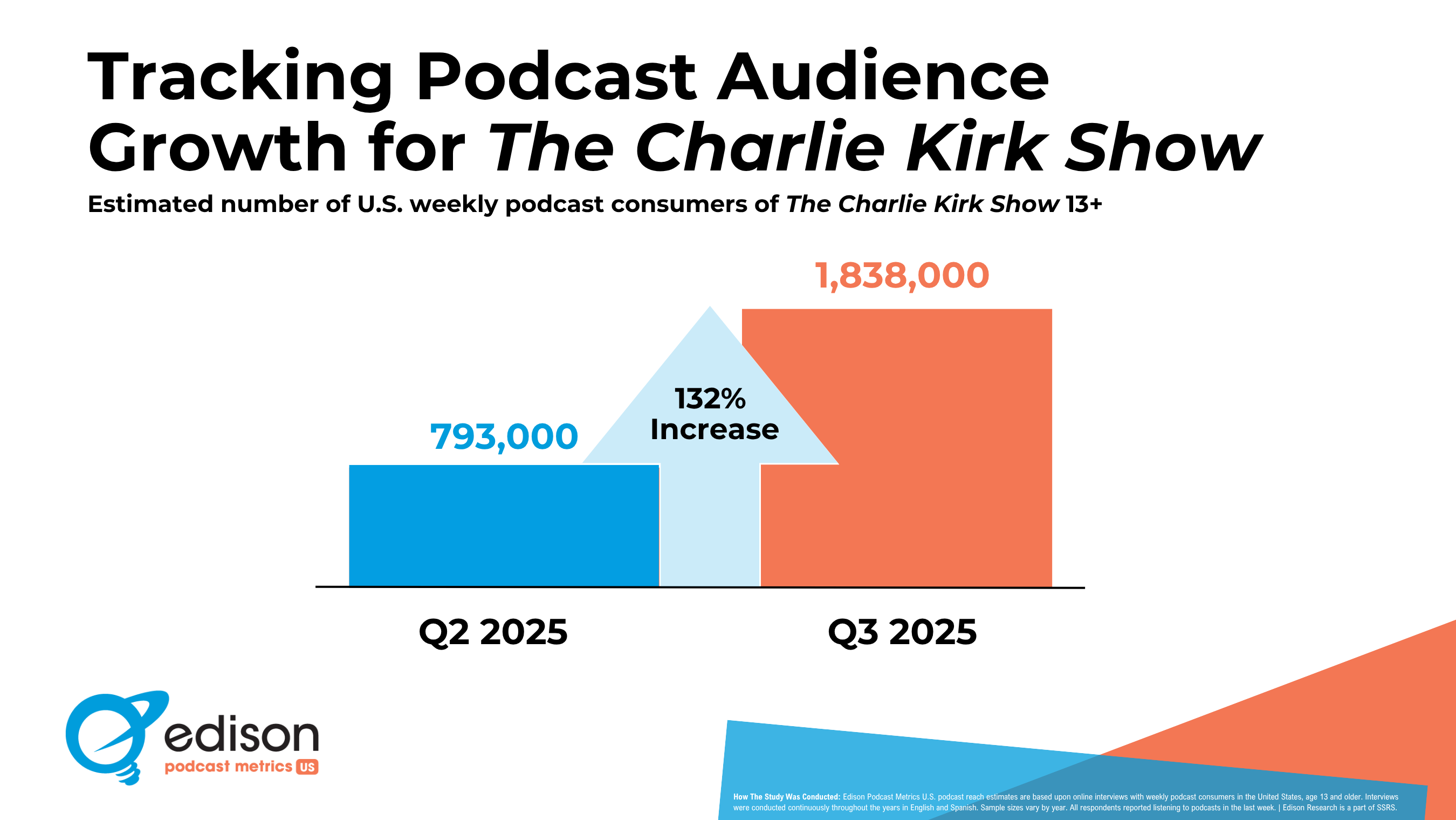 With new episodes continuing posthumously and Erika Kirk promising to carry on her late husband’s legacy, future data will reveal if the show carries forward its Q3 momentum or attracts new podcast consumer segments. Make sure you subscribe to this weekly newsletter to stay connected to the biggest audio insights and learn more about Edison Podcast Metrics here.