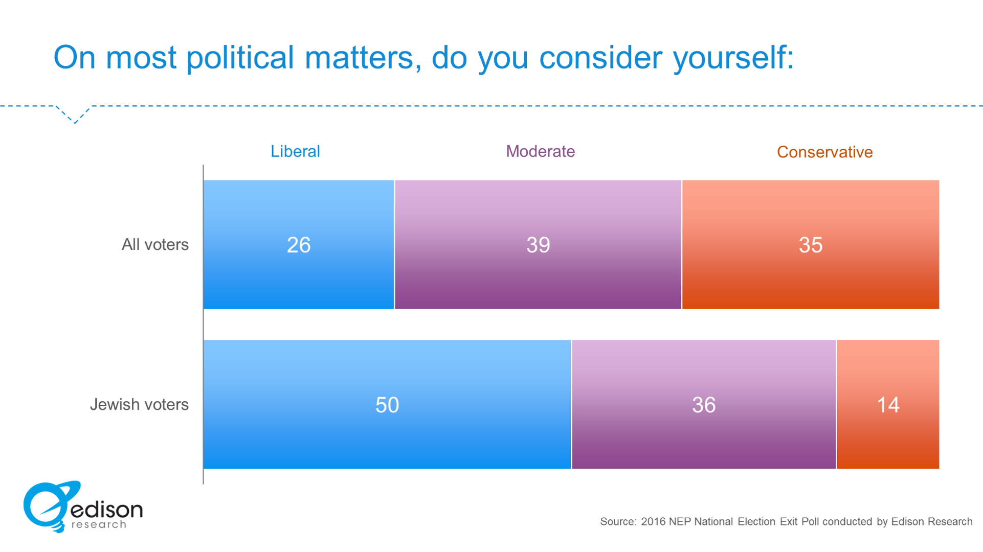 Regardless of policy decisions or other appeals from Republicans, the connection between Jewish voters and the Democratic Party is intertwined with the essential liberalism of the Jewish electorate. For instance, in the 2016 Presidential election while only one-quarter of all voters considered themselves ‘liberal’, fully half of Jewish voters said they considered themselves liberal.